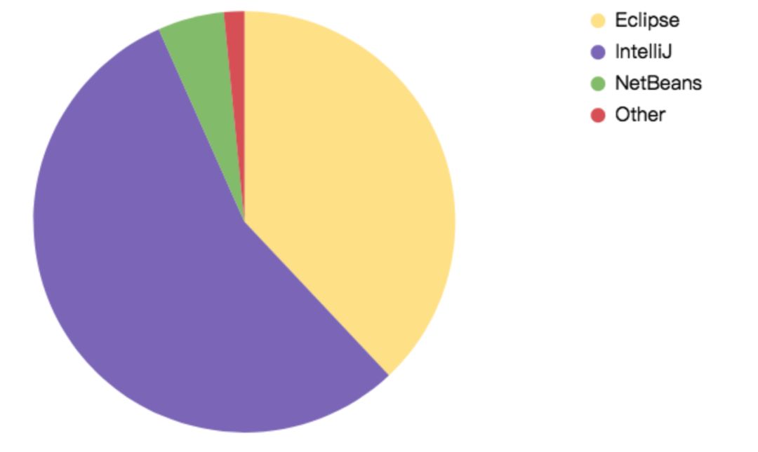 IntelliJ IDEA 由去年的 45.8% 增长到今天的 55.4%,显然赢得了今年 Java 领域的 IDE 王者之战。
