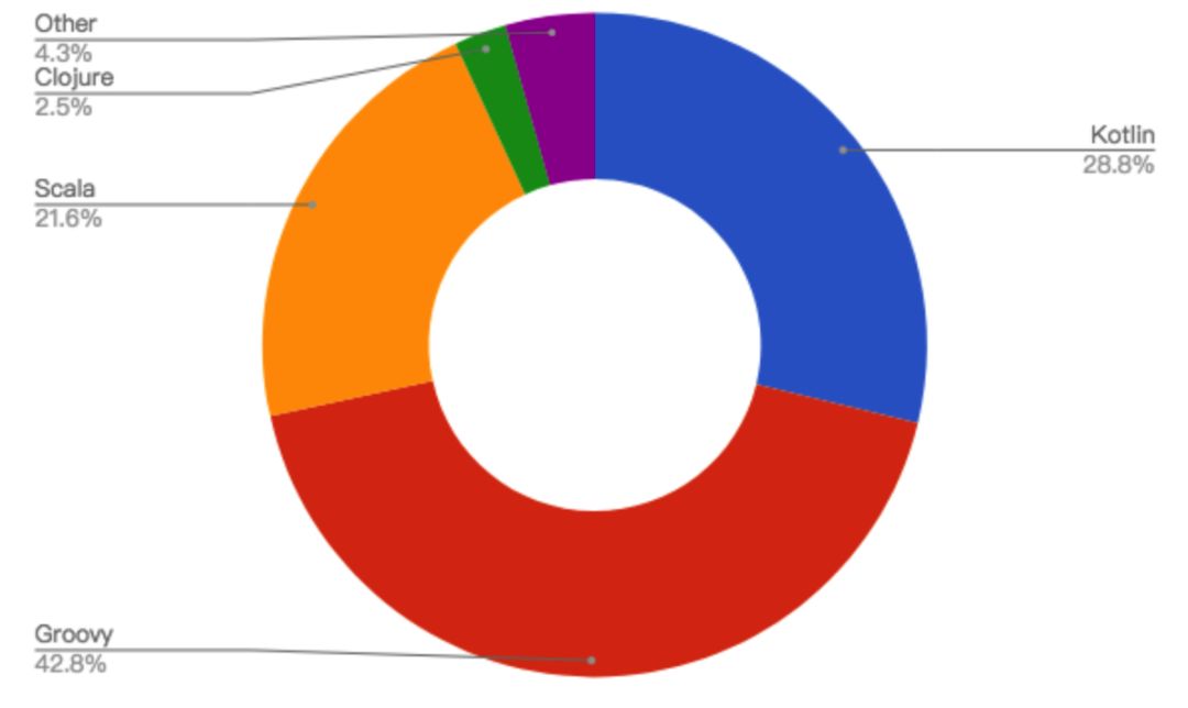 对剩余的 JVM 语言,画一个饼状图,不得不提 Kotlin —— 这是疯狂的一年,从 2017 年的 11.4 跃升至今天的 28.8%。