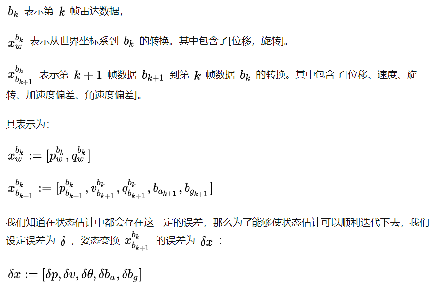 误差状态卡尔曼滤波(ESKF)也有着上面的五大方程组。唯一的区别在于卡尔曼滤波针对的是物体的运动状态,而误差状态卡尔曼滤波针对的是物体运动状态的误差状态。