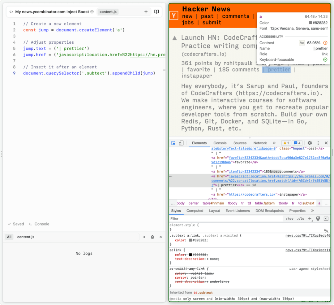 比如,Arc 有一项叫做网页增强(Boost)的独家功能就是我格外赞赏、双手支持的。简单来说,如果你觉得网站的任何部分看着不顺眼,可以立刻分屏打开一个编辑窗口,注入自定义的 CSS 和 JavaScript 代码,调整出想要的外观和功能。