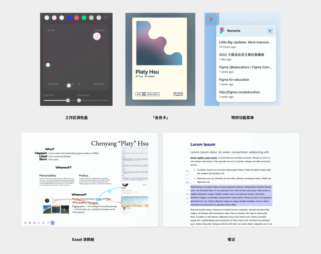 工作区的目的是分开不同的浏览场景和任务领域。例如,生活和工作、不同工作项目、临时杂事等。每个工作区都有独立的名称、图标和配色。本质上,人们用不同浏览器处理不同任务的冲动,是想在情景之间构造视觉上、进而是心理上的区隔。Arc 工作区的设计可以很好地迎合这种诉求。