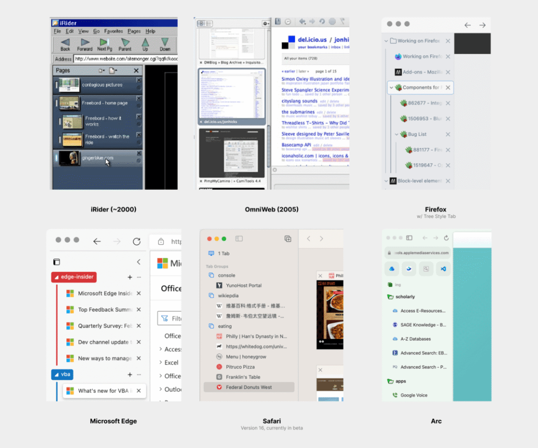 应当指出,垂直标签栏不是什么新事物——我能找到最早的先例,是 2000 年前后的 iRider 浏览器。近年来,Edge 和 Vivaldi 也提供了类似功能。但要说将垂直标签栏作为默认且唯一的选项,当代浏览器中确实罕见。