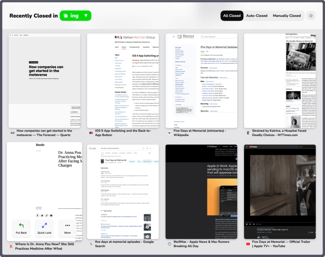 如果你会用手机里的「最近删除」相册,你也就已经学会了 Arc 的归档。在这里,标签显示为大尺寸缩略图,按关闭时间倒序排列、按关闭方式和原始位置分组。鼠标悬浮后,可以选择放回原处、弹窗预览或永久删除。比起传统浏览器里素面朝天的历史记录,归档确实更符合当下人们的使用习惯。