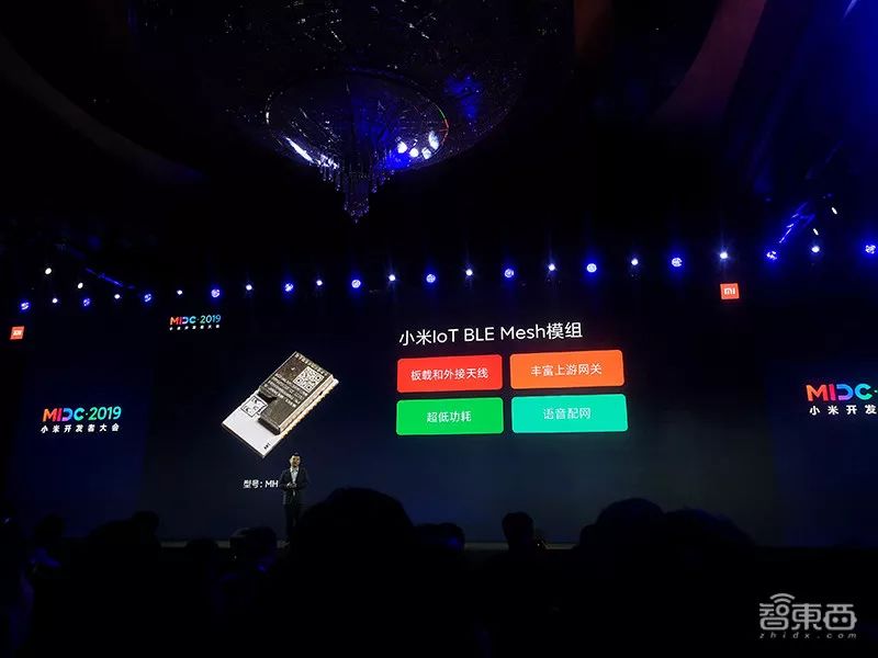 在消费者AIoT方面,范典则带来了几款硬件新品:首先是小米IoT BLE Mesh模组,型号MHCB05P,它具备超低功耗、语音配网、板载和外外接天线等特性,能进行超大规模的密集组网,价格低至6元。