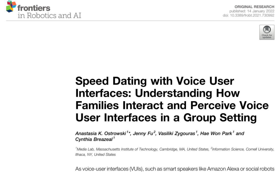 该研究成果以“Speed Dating with Voice User Interfaces: Understanding How Families Interact and Perceive Voice User Interfaces in a Group Setting”为题,发表在 Frontiers in Robotics and AI 期刊上。