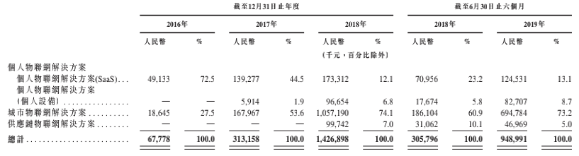 2016年,个人物联网解决方案(SaaS)占比72.5%,到了2018年,降至23.2%;2016年,城市物联网解决方案占比27.5%,到了2018年,升至60.9%。