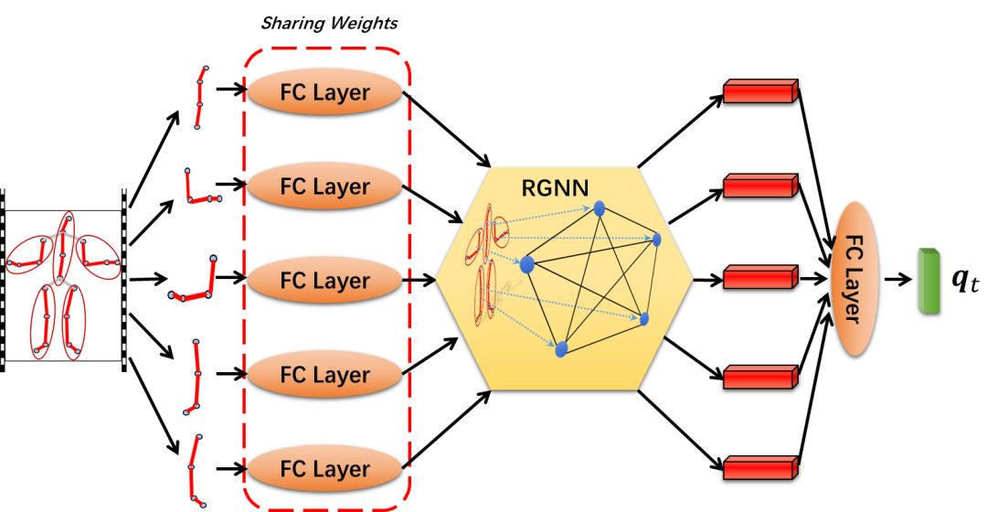 在空间上,我们将人体结构划分为多个身体部位,如:头、手臂,躯干、腿等结构,并提出利用一个残差图神经网络(residual graph neural network(RGNN))去建模各个身体部位之间的人体结构特征。