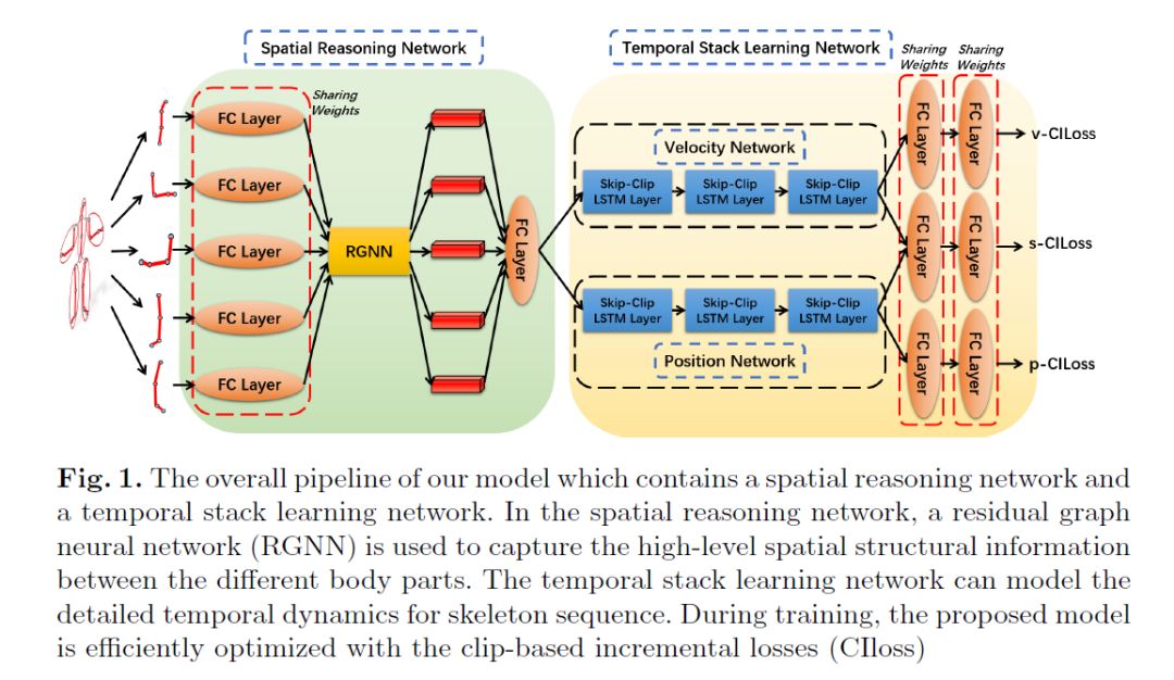 近几年基于人体骨架的行为识别已经有很多工作,这些工作在公开数据库上的精度都有很好的提升,但是仍然有一些问题没有解决:1、人的运动是由各个part协调完成的,如行走不仅需要腿的运动,还需要手臂的运动维持身体平衡,但是大部分的工作将人体的关键点直接concatenate成vector, 然后输入到LSTM里面处理,这样是很难学习到人体结构的空间特征的。2、现有的方法利用LSTM网络直接对整个骨架序列进行时序建模,然后利用最后一时刻的hidden state作为时序的表示,这样对于短时序是有效的,但是对于长时序序列,最后一时刻的状态很难表示整个序列的时序特征,也不能包含详细的时序动态特征。为了解决这两个问题,我们提出了Skeleton-Based Action Recognition with Spatial Reasoning and Temporal Stack Learning [5]。
