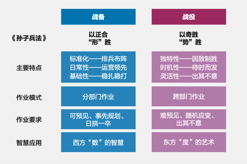 从双方关系看,战备、战役共同体是动和静、虚和实的结合。战备是排兵布阵,战役是因敌制胜;战备追求运营领先,战役追求待时而发;战备要求稳扎稳打,战役要求出其不意。战备追求“形”胜,战役追求“势”胜。具体到其各自特点上:战备是基础性、日常性工作,有具体标准,可预见和可流程化;战役具有灵活性、独特性,需要即兴发挥和随机应变;战备是分部门作业,战役需要跨部门协作;战备看重扎实的基础,信奉长期主义,讲究日拱一卒、滴水穿石之功;战役则看重杠杆的力量,强调对竞争格局的动态把握及对顾客认知的瞬间引爆,主要靠指挥者的敏锐观察、独特想象力等软实力。