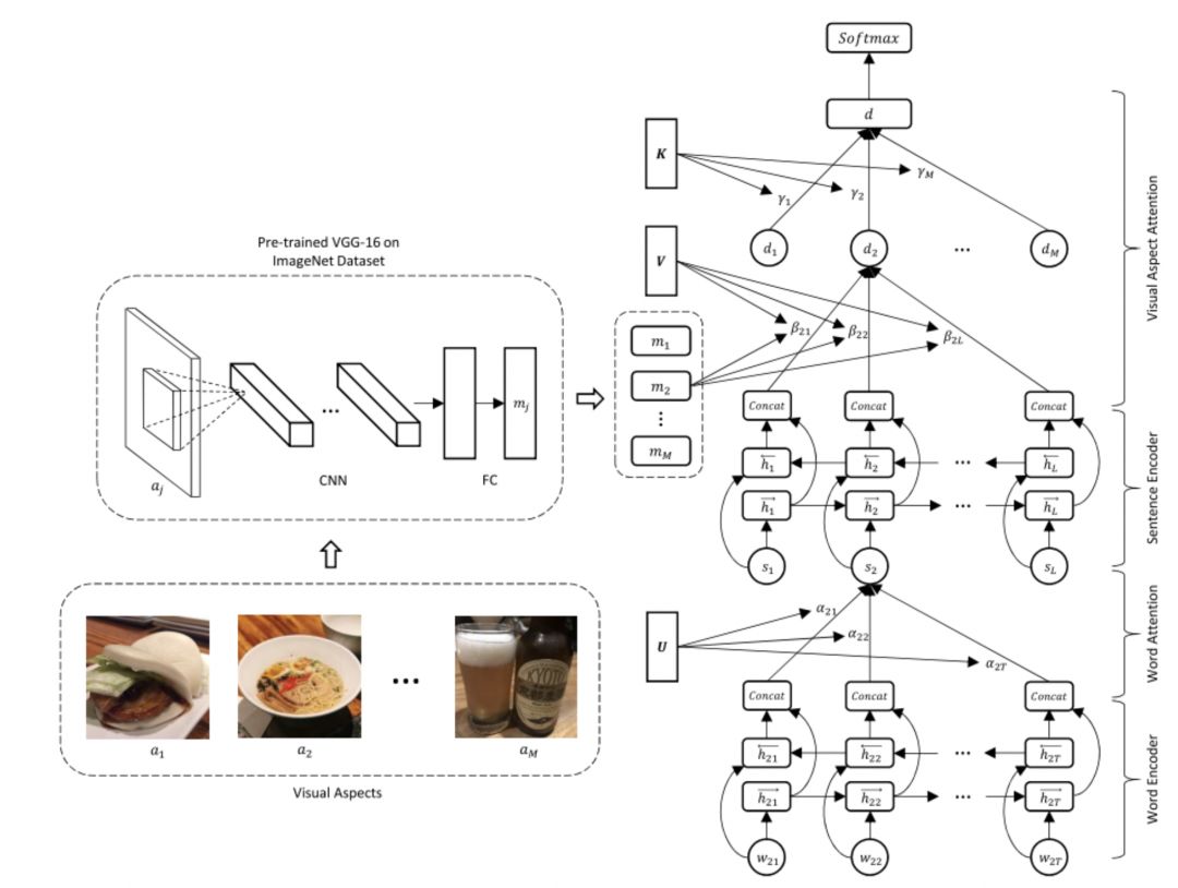 如图1所示,VistaNet具有三层结构,分别是词编码层、句子编码层和分类层。词编码层对一个句子中的词语进行编码,再经过soft-attention得到句子的表示。句子编码层对上一层得到的句子表示进行编码,再通过视觉注意力机制(visual aspectattentino)得到文档表示。文档表示作为分类层的输入,输出分类结果。从结构上来看,VistaNet和Hierarchical Attention Network基本相似,都是用于文档级情感分类,都有三层结构,且前两层都是GRUEncoder+Attention的结构,二者的不同点在于VistaNet使用了视觉注意力机制。