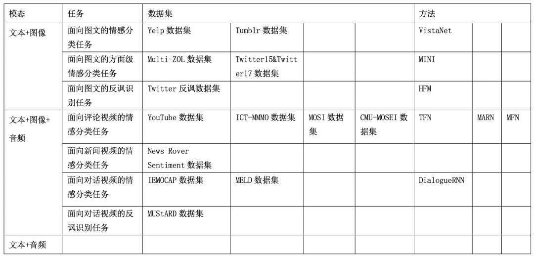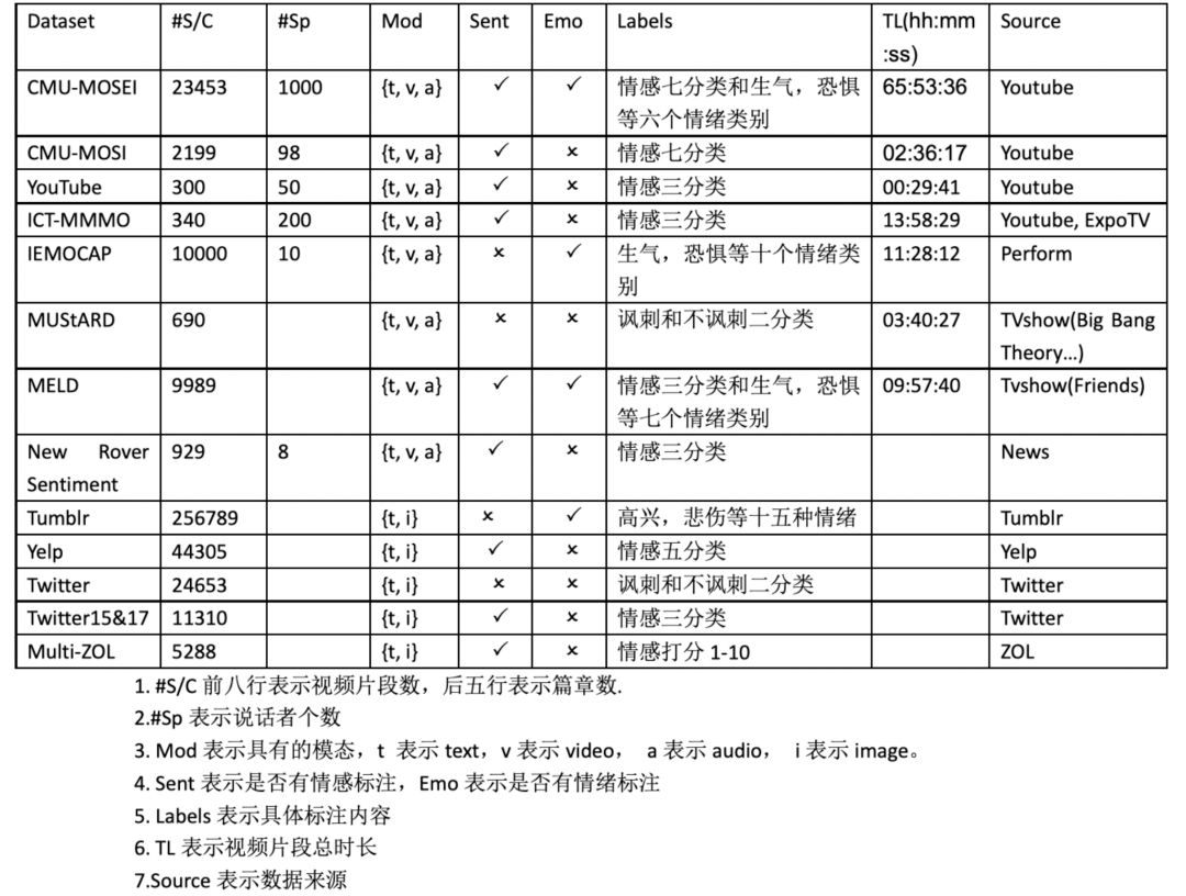 本文总结了13个公开数据集,其中包括8个视频数据集和5个图文数据集。本文还总结了与面向图文的情感分类任务,面向图文的方面级情感分类任务,面向图文的反讽识别任务,面向评论视频的情感分类任务和面向对话视频的情感分类任务五个任务对应的相关研究方法。