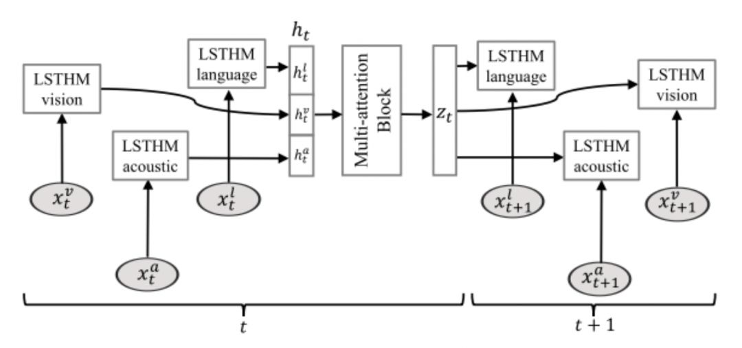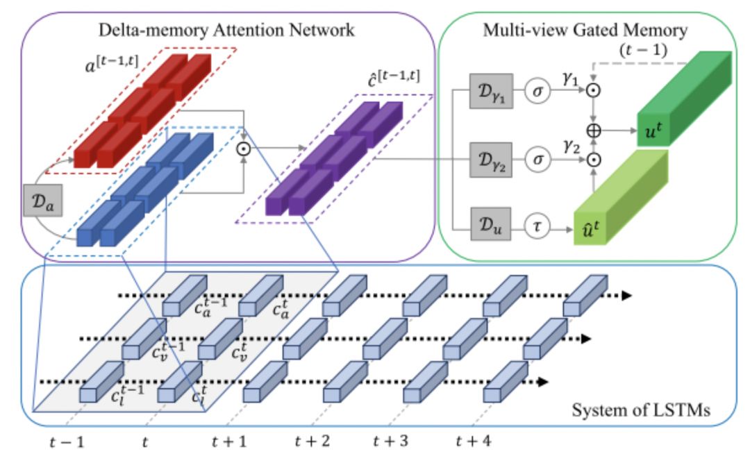 MARN考虑了注意力权重的多种可能分布,MFN则考虑了注意力处理的范围。MFN和MARN一样将模态融合与编码相结合,不同的是,在编码的过程中模态间是相互独立的,由于使用的是LSTM,并没有一个共享的混合向量加入计算,取而代之的,MFN使用“Delta-memoryattention”和“Multi-View Gated Memory”来同时捕捉时序上和模态间的交互。保存上一时刻的多模态交互信息。图6展示了MFN在t时刻的处理过程。