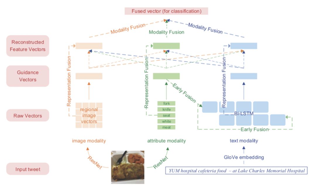 HFM(HierarchicalFusion Model)在文本和图像双模态的基础上,增加了图像的属性模态(Image attribute),由描述图像组成成分的若干词组成。如图3所示,图片包含了“Fork”、“Knife”、“Meat”等属性。作者认为图像属性能够将图像和文本的内容联系起来,具有“桥梁”的作用。