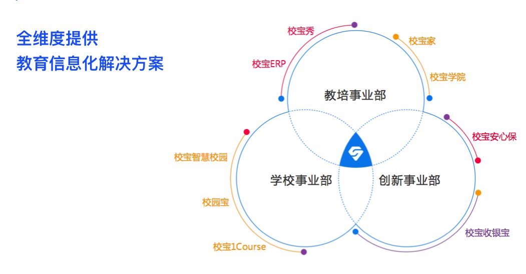 目前,针对教培行业,校宝围绕营销招生、教务管理、家校互动等机构刚需,推出覆盖管理运营全流程的行业级解决方案,通过ERP、校宝秀、校宝学院等产品全方位为机构赋能;而针对全日制学校,校宝智慧校园与校园宝则根据国际化、民办校和公办校的不同需求,全面推进智慧校园建设;并配合新高考改革等政策变化,推出“智能排课”、“走班排课”等创新产品,助力全日制学校的数字化发展。同时,依托多年的经验和数据积累,校宝还和蚂蚁金服、人保、平安等推出了校宝收银宝、校宝安心保等增值服务产品,深度服务B端客户。