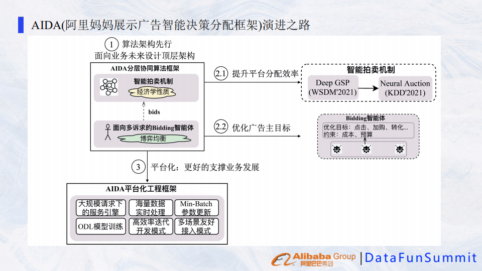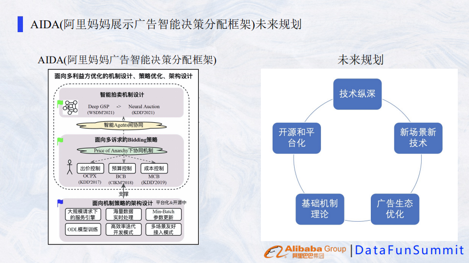面向未来业务发展,多方利益优化、经济性公平均衡等,阿里妈妈展示广告设计了智能决策分配框架,简称AIDA。