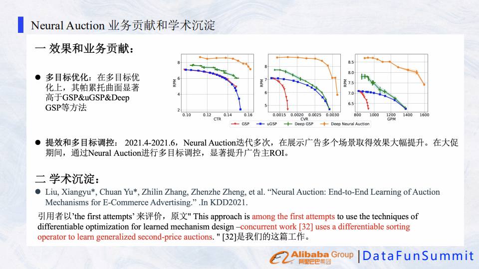 在多目标优化方面,帕累托曲面显示Neural Auction效果优于GSP、uGSP、Deep GSP。在提效与多目标调控方面,Neural Auction在2021.4 - 2021.6做了多次迭代升级,在展示广告多个场景效果取得大幅提升。大促期间,多目标调控显著提升了广告ROI。