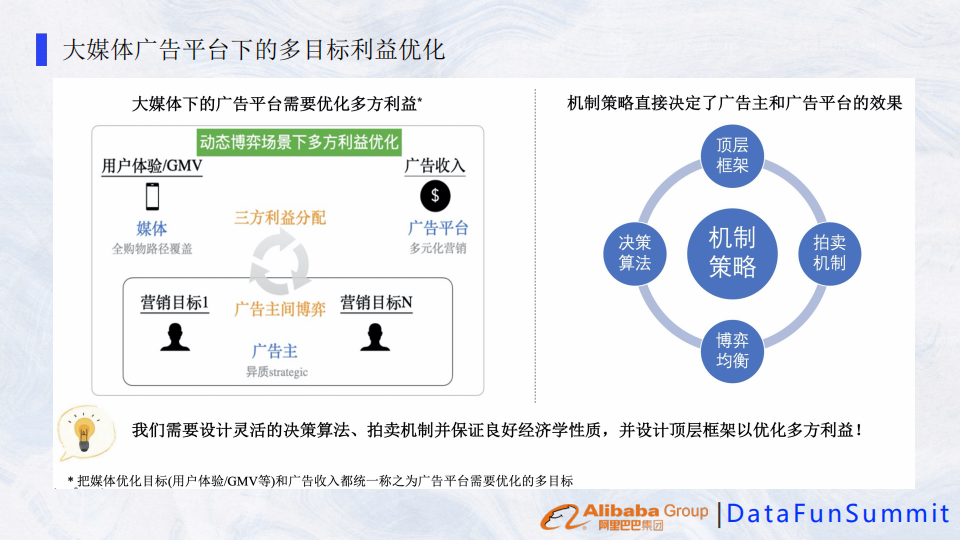 基础机制理论探索:传统的机制设计,假设广告主优化目标单一,物理推导或者技术设计相对简单。目前整个智能化的广告系统,广告主营销的商业目标变得更加多样化。广告主优化目标的研究,决定机制设计优化方向。