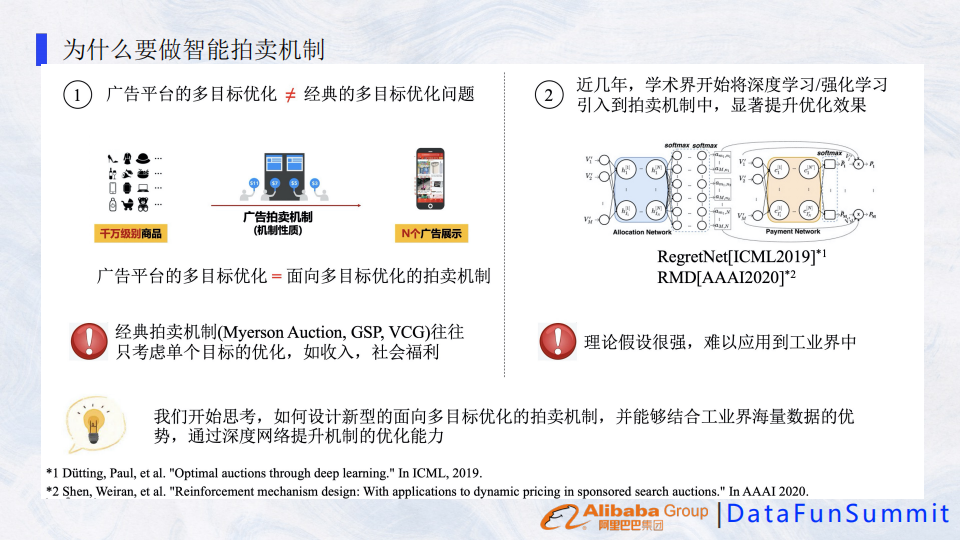 因此我们开始思考,如何设计新型的面向多目标优化的拍卖机制,并结合工业界海量数据的优势,通过深度网络提升机制的优化能力。