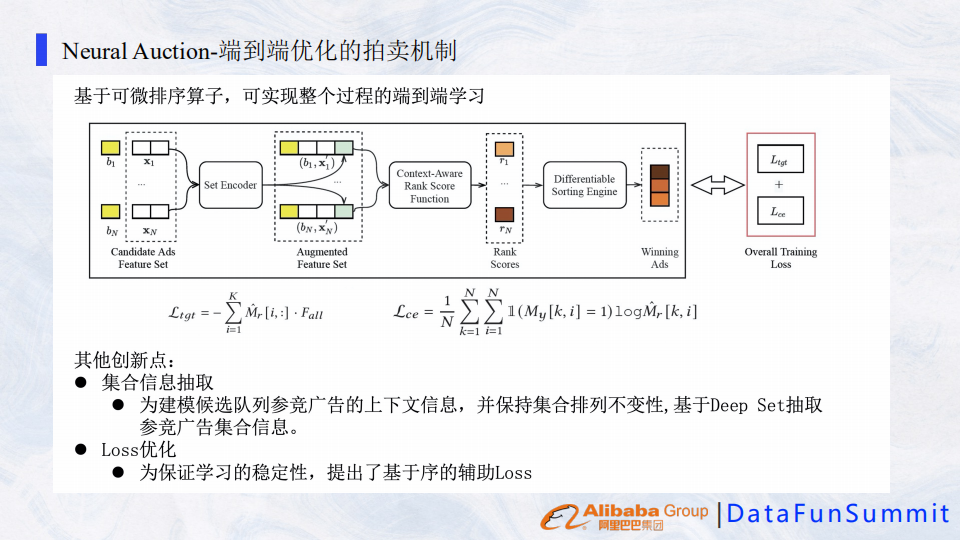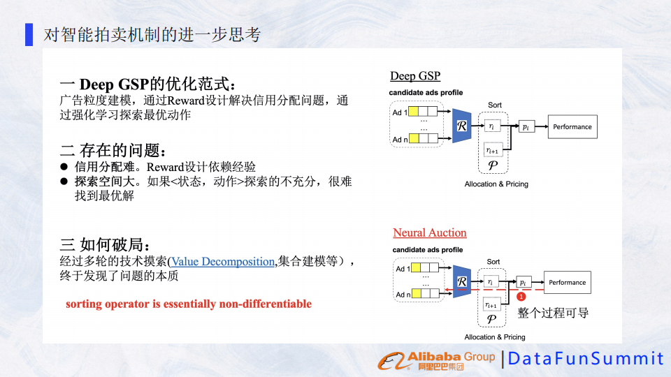 为突破Deep GSP的问题,经过多智能体value分配或者集合建模,尝试将所有的广告主参竞放在一个集合中优化,建模和效果在同一个维度,省去做信用分配,单目标优化有效,但是多目标优化效果不明显。单目标是端到端优化,只要学出value的分布,然后进行softmax,将最大的作为展示广告,第二作为扣费。多目标下需要对所有的广告先排序,基于排序结果进行分配扣费,但是排序过程不可微,无法像监督学习通过优化效果,通过Loss反向传递驱动模型训练。因此,推出Neural Auction拍卖机制,通过最后的效果反向传导的方式,驱动整个模型训练,实现端到端学习。