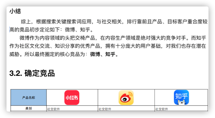 上图,A同学将小红书定位为社交产品,所以最终选定的竞品为:微博和知乎;下图,B同学将小红书定位为 社交+电商型产品,所以选取的竞品是得物,并将抖音作为了间接竞品。