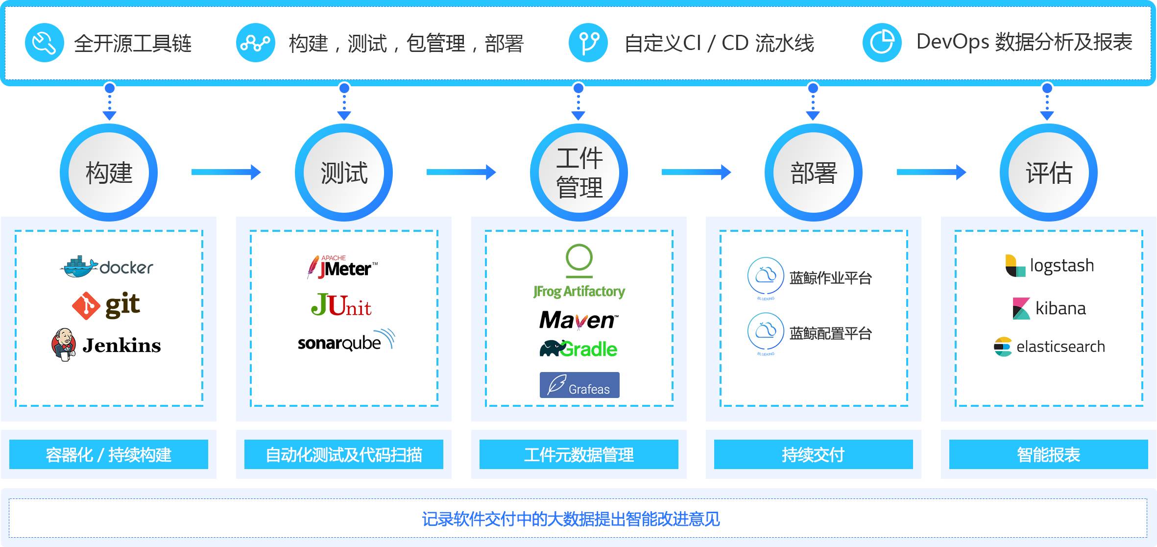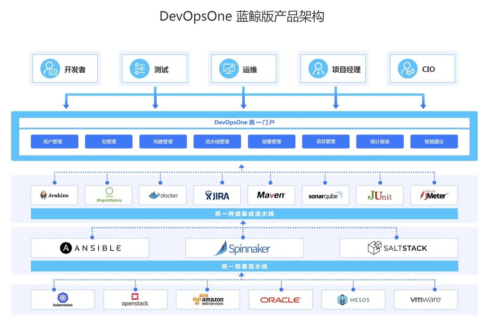 我们还有一个平台,提供一站式的快速发布服务。我们今天看很多公司都有一个页面去做整套 DevOps,但这些都不是开源的,也不能快速地落地。我们跟腾讯联合开发了一个应用叫 DevOpsOne(官网:devopsone.cn),对接到蓝鲸做部署,下一步我们要做一个全开源的平台,这个开源的平台就是做甲骨文、思科做过的事情。具体做法是封装这些开发工具链,提供一个统一的平台去做流水线、部署、测试,报表及数据挖掘,全面降低 DevOps 上手的复杂度。
