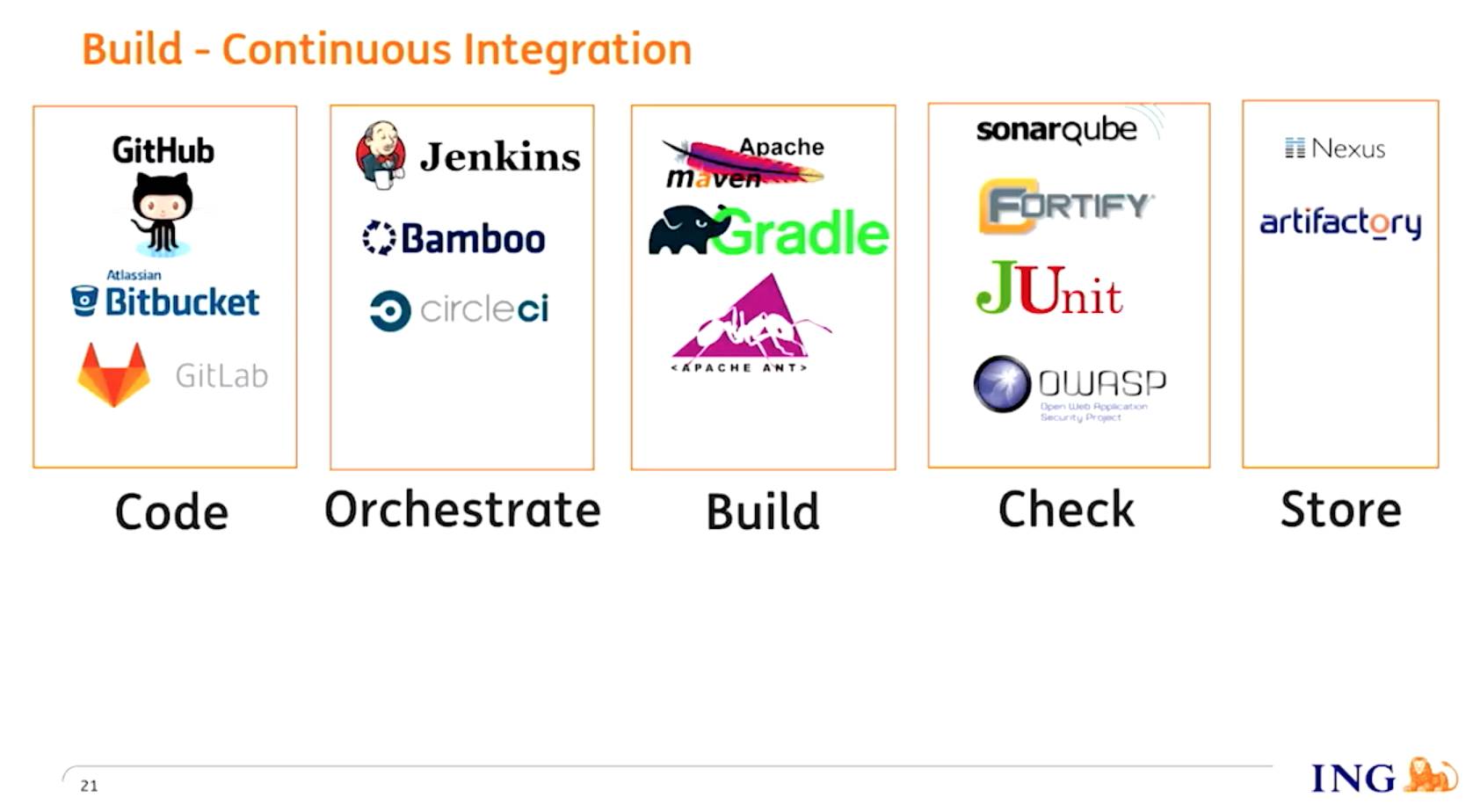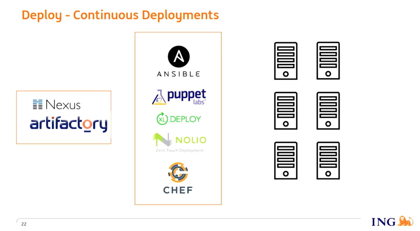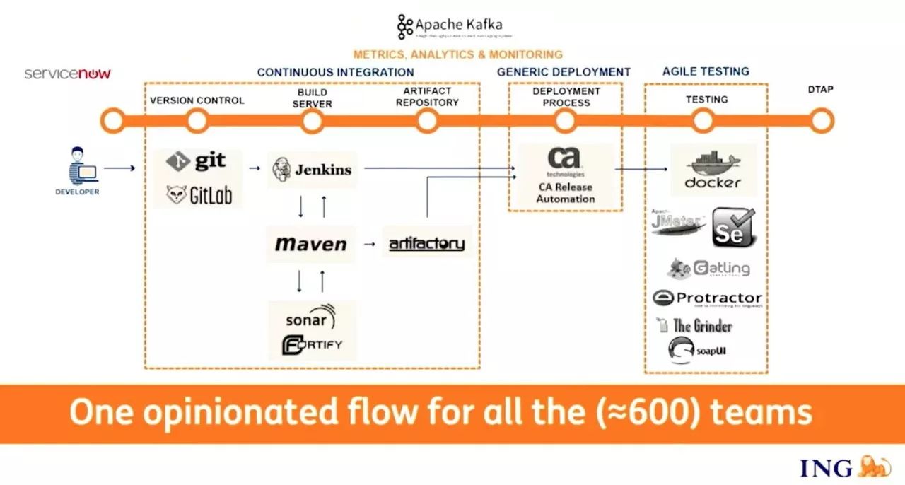 他们的目的是最终实现 600个团队的支持,一个自定义的流水线,从拉源码开始,然后做一些测试,把包放到 Artifactory,他们用一些付费的工具去做部署,测试也很多跑在 Docker容器里面。ING提供的统一交付平台对接了很多工具,覆盖了代码管理、构建管理、工件管理、部署管理、环境管理等上线所需的功能,为 ING的内部 IT 团队提供了可靠的交付流水线。