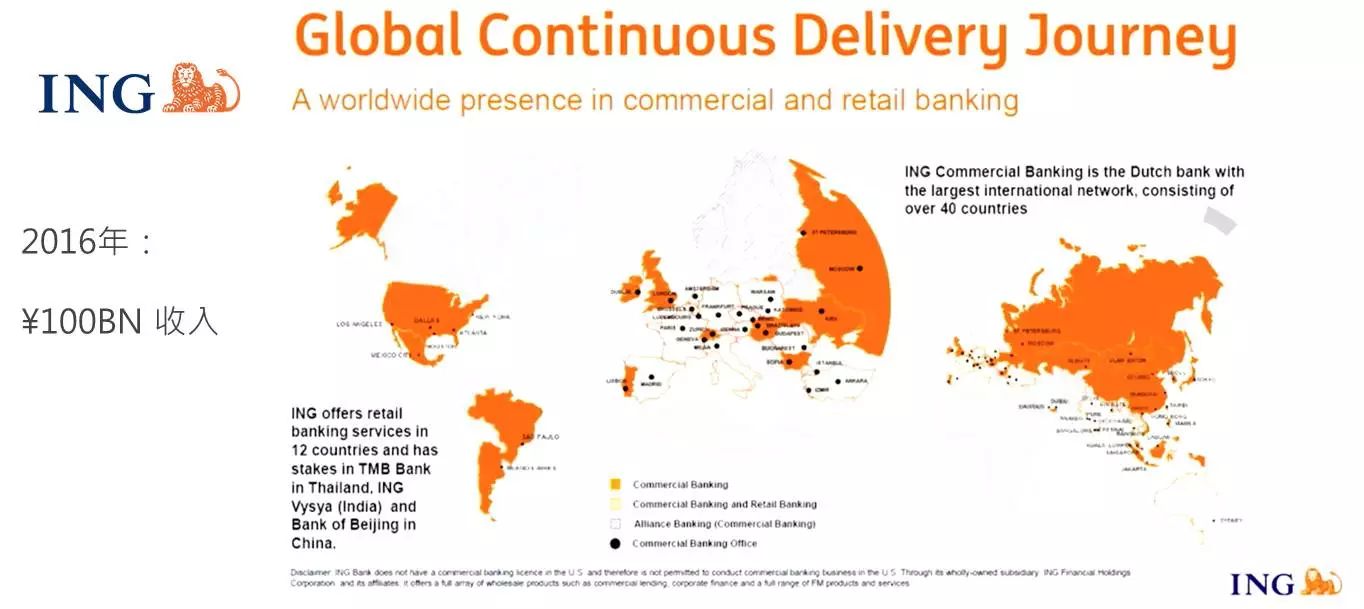 第三个例子是 ING。ING是全球金融巨头,虽然中国的银行在全球十大银行里面占了 6个,但 ING在国外算是比较大规模的了,去年超过 1000亿收入的规模,也有全球的研发中心。现在他们要面对国内很多金融公司要面对的事情,就是怎么从传统的开发模式变成一个超前的 DevOps模式。