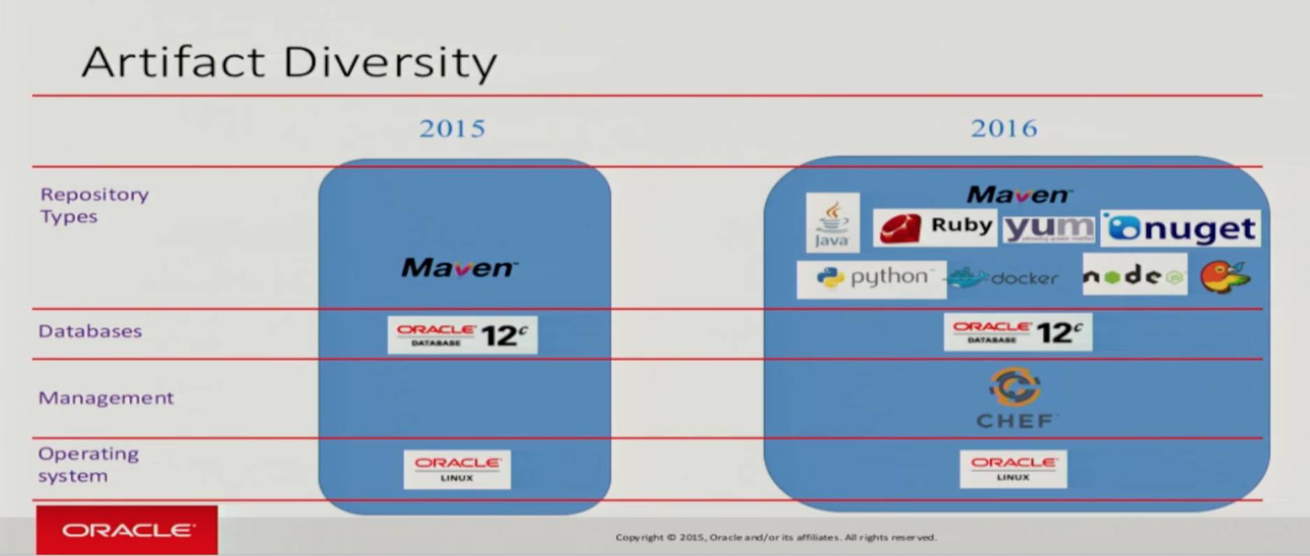 于是,他们在一年之内把这个数据库的团队和甲骨文其它的团队迁移到了 DevOps 平台上,因为他们都发现做同一持续交付平台的好处是很明显的,那么从 2015年开始,这个平台通过 API的方式可以去支持任何开发工具、开发语言,就是最开始讲的一个很关键的事情,如果要做公司内部的平台,未来肯定要扩容。就像我现在虽然只有 Java 开发,但将来我们收购了一个小公司,他们用的是别的语言,我必须能够变得能够支持别的语言。