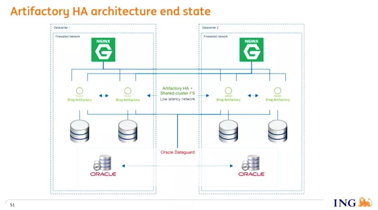 金融行业比较关注的是高可用的容灾,这些包肯定要用容灾的,那么可以做高可用的包管理,也可以用多个节点去做分流。例如华为,在深圳有七个 Artifactory的节点,因为他们要进行几万开发团队的并行上传、下载,是非常高的并发构建。