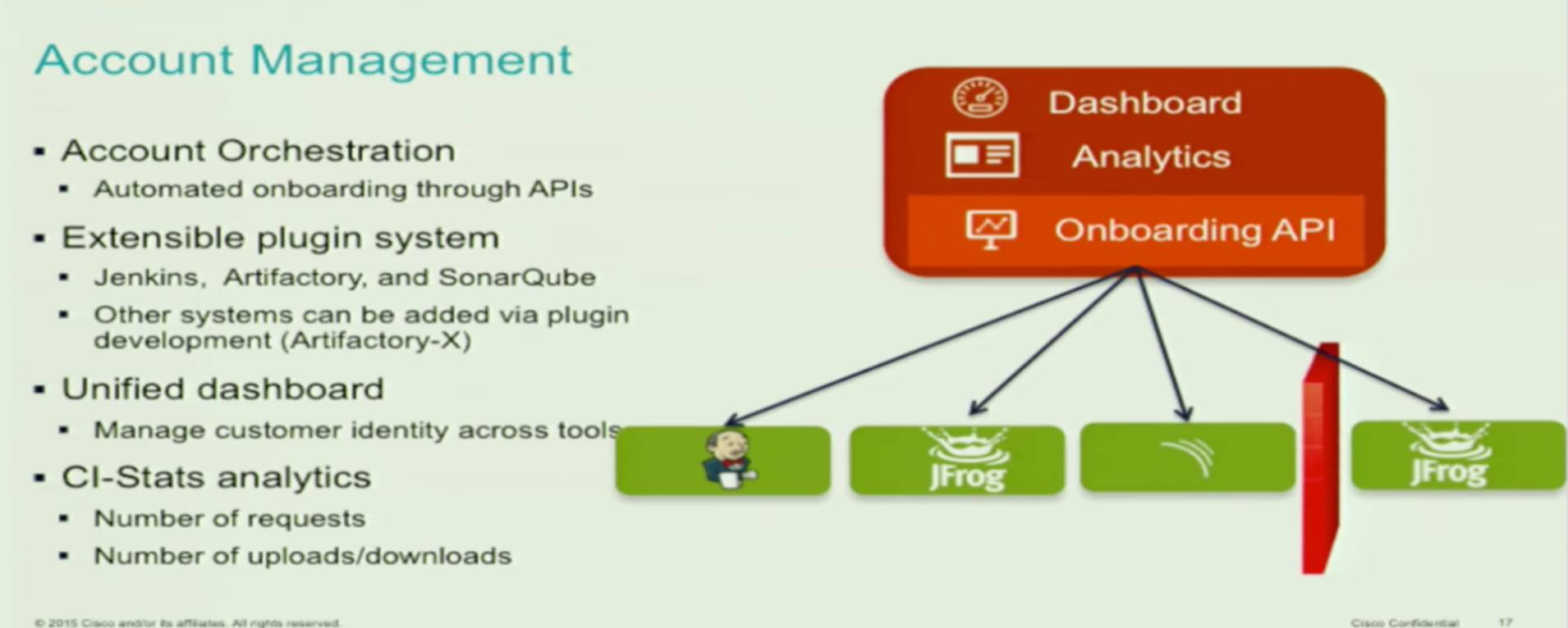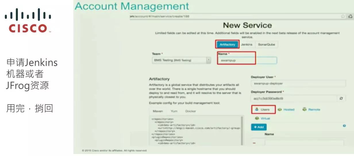 最后介绍下思科,思科的平台叫 Account Management,他们有一个 5人团队,做了一个平台,可支持全公司 3万开发者,同时也是全球多地开发的。Account Management是封装 Jenkins、JFrog,从图中可以发现基本上是一样的工具。Account Management通过给团队一个页面,去申请一个 Jenkins容器,申请 JFrog的资源外包,都在 Account Management里。