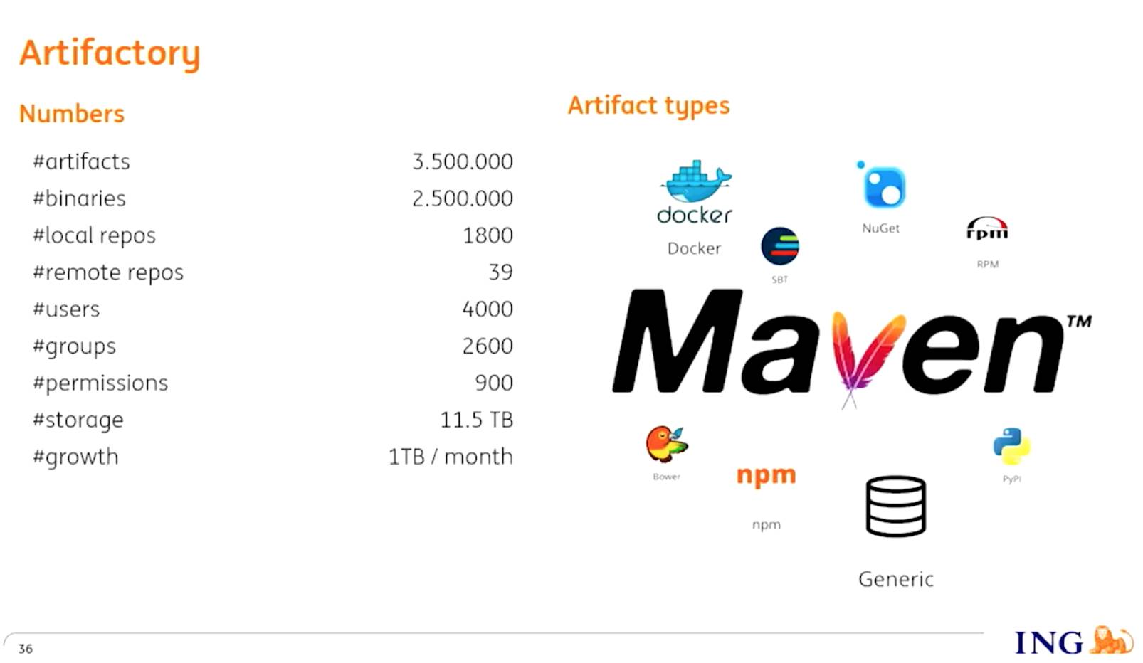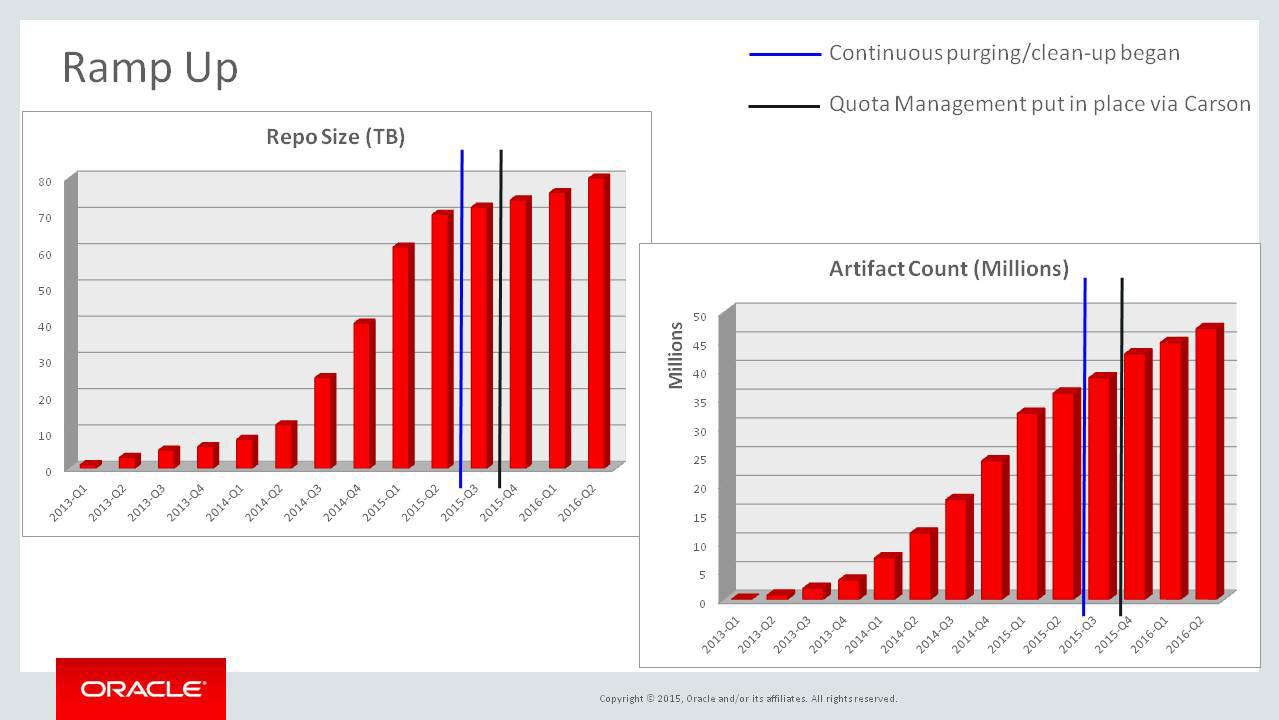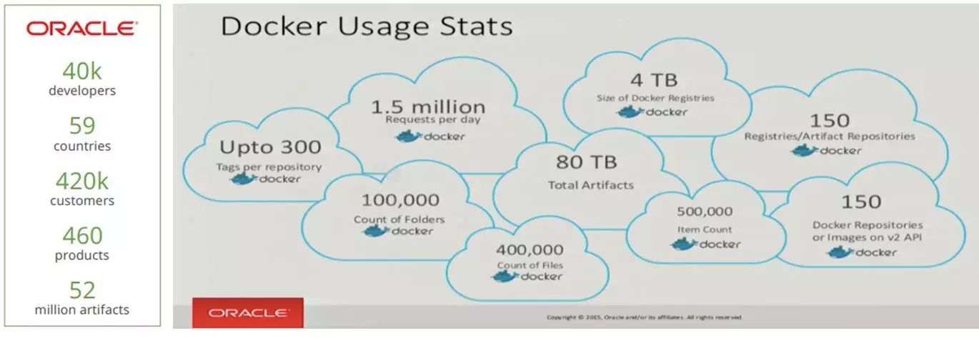 甲骨文是 JFrog Artifactory 的早期用户,在 2013年 -2015年间,他们某一个研发中心某一个仓库的数据,一年半之内从 17TB涨到了 70多 TB,这还只是其中一个研发中心(甲骨文有 6个研发中心),当数据达到 70多 TB时,他们开始做一些自动化的删除,前面也讲过了一个规范,如果包在半年之内没有被用到、没有被下载,这个包就会被删掉,都会用这个去做。