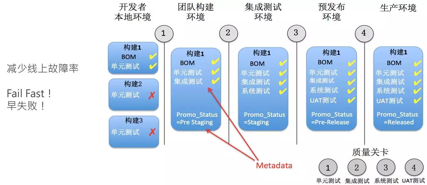 质量关卡是一个比较老的概念,Jenkins和 JFrog是怎么参与到这个过程中的呢?答案是用自动化测试供,通过把测试结果和这个包绑定,如果想要把发布的包从开发环境升级到测试环境,再到部署环境,必须得收集到特定的元数据才可以到下一个阶段,这个叫质量关卡,很多大企业现在就是用的这个标准,即如果我的 Released包没有具备所有的测试信息,流水线不会让它到部署到我的生产环境,这个主要是去保证软件的质量,正如之前讲的“快速失败”,如果把一些自动化测试、继承测试放在一个早一点的阶段,就可以避免浪费很多的时间。