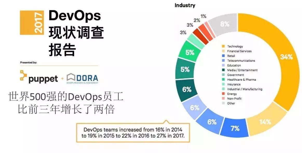 我们看看 DevOps 的发展状况,通过每年的 DevOps 现状调查报告,我发现了一个比较有意思的现象:前三年,公司内部叫 DevOps 工程师的员工数量增长了两倍,现在很多公司有专门的 DevOps 工程师。创业的人都知道,找技术团队肯定是先找开发、再找运维、第三找 DevOps。现在很多硅谷公司是 DevOps 和开发一起找,因为 DevOps 工程师可以用很多较超前的工具做快速发布。