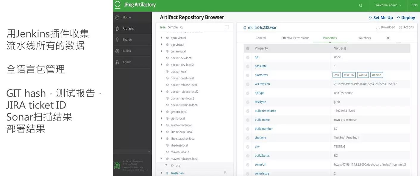 中间工件管理部分也是比较关键的,包括你的数据管理在每个阶段从提交代码一直到构建、测试,发布到什么环境,都是存在一个地方,所有的数据和包都是存在 JFrog Artifactory 里面,都要通过各自公司内部的标准区做流水线。