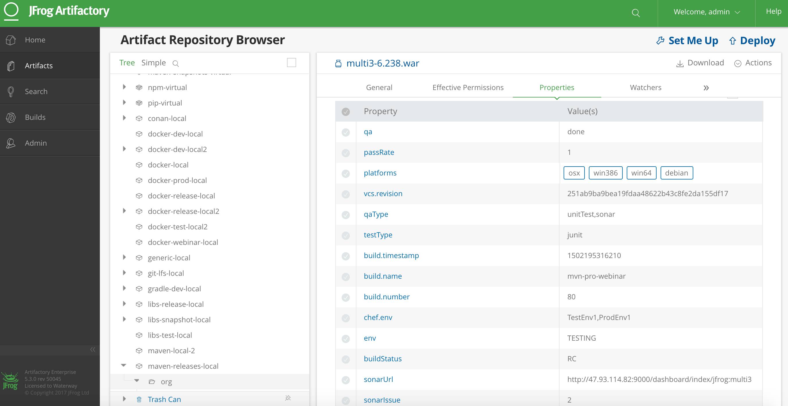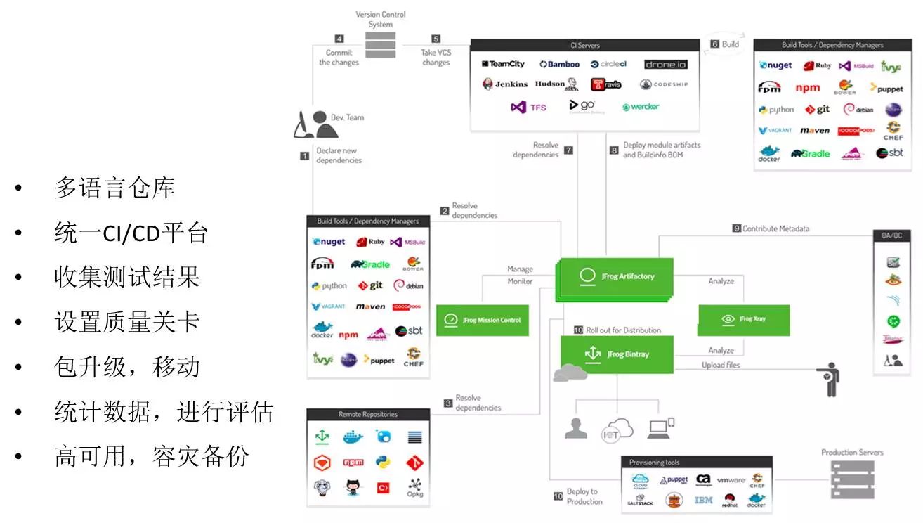 部署的话,他们也能部署到多个工具,比如 Artifactory,因为不同的研发中心,不同的团队,不同的工具都要去做部署。所以这个平台得非常灵活,能够支持很多团队的工作。他们也是多元的,有 Maven、Docker、NPM等,他们都要开始管理。