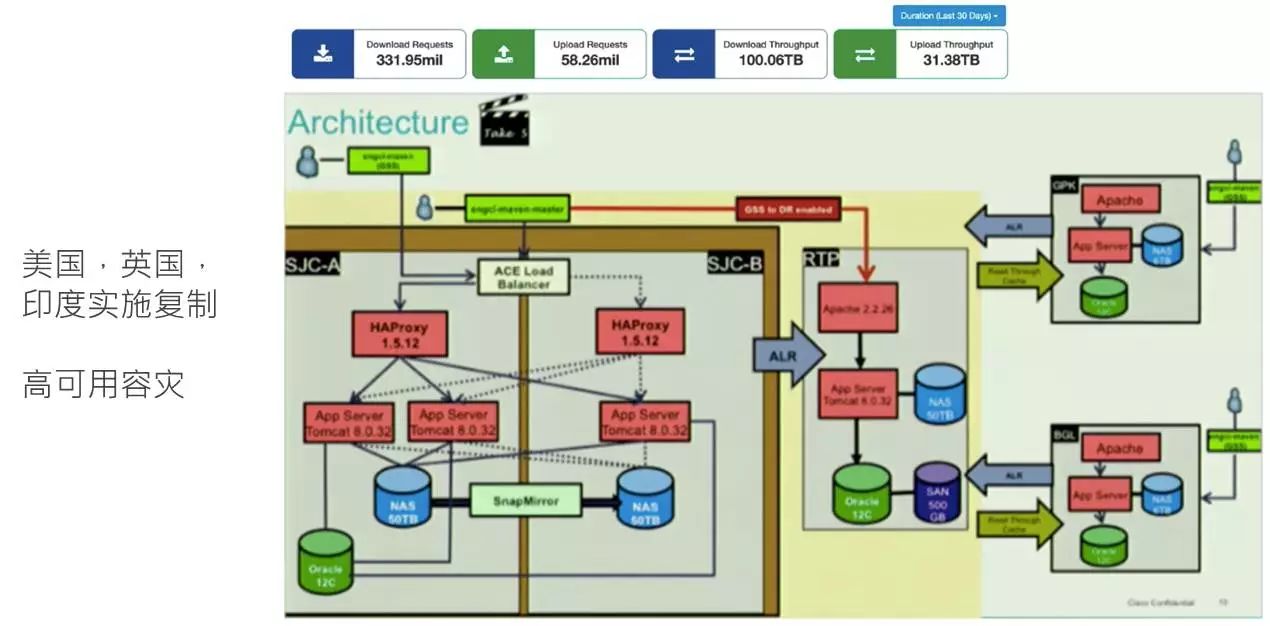 它们也有全球的包复制方案,他们在美国的硅谷有一个高可用的容灾,英国和印度都要做实时复制,比如说他们的某一个包是在硅谷构建,但要复制到印度去做测试,这就需要有实时复制的能力,这里都是用高可用容灾去做实时复制。