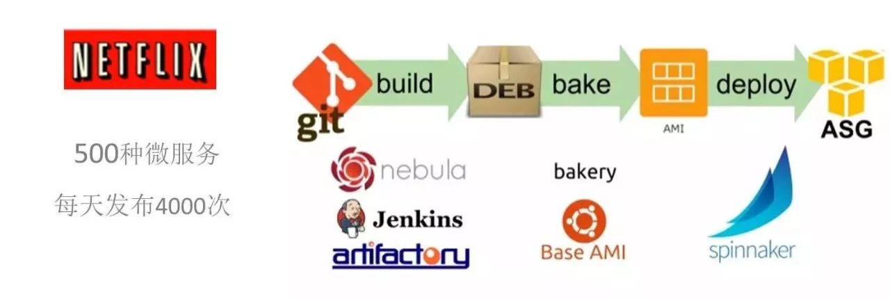 第一个例子是 Netflix。Netflix在开源社区是一个非常大的贡献者,他们开发了很多开源工具去做部署、打包等各种功能。 其中有一个做混合云环境部署的工具叫 Spinnaker,Spinnaker 是 Netflix在的一个开源的项目,能够实现跨云平台的部署任务的编排。现在 Netflix 使用 Spinnaker 每天发布 4000 次变更到亚马逊的机器上。谷歌云也在用 Spinnaker 去做部署。他们构建时也是用 Jenkins,其中有一个过程叫 bake,bake 是把应用打包成一个镜像,然后把这个镜像用 deploy 去做部署。Netflix 的 DevOps实践非常值得关注,他们也有很多项目和开源工具都值得一看。