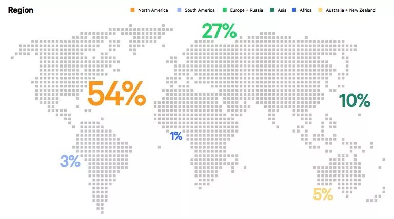 我们看一下全球在做 DevOps 的公司分布。从上图可以看出一个很大的问题,就是亚洲明明有很高的消费能力,有很多智能手机的用户,但亚洲只占全球的 DevOps 工程师数量了 10%,而欧洲和美国却占全球最大的一部分。