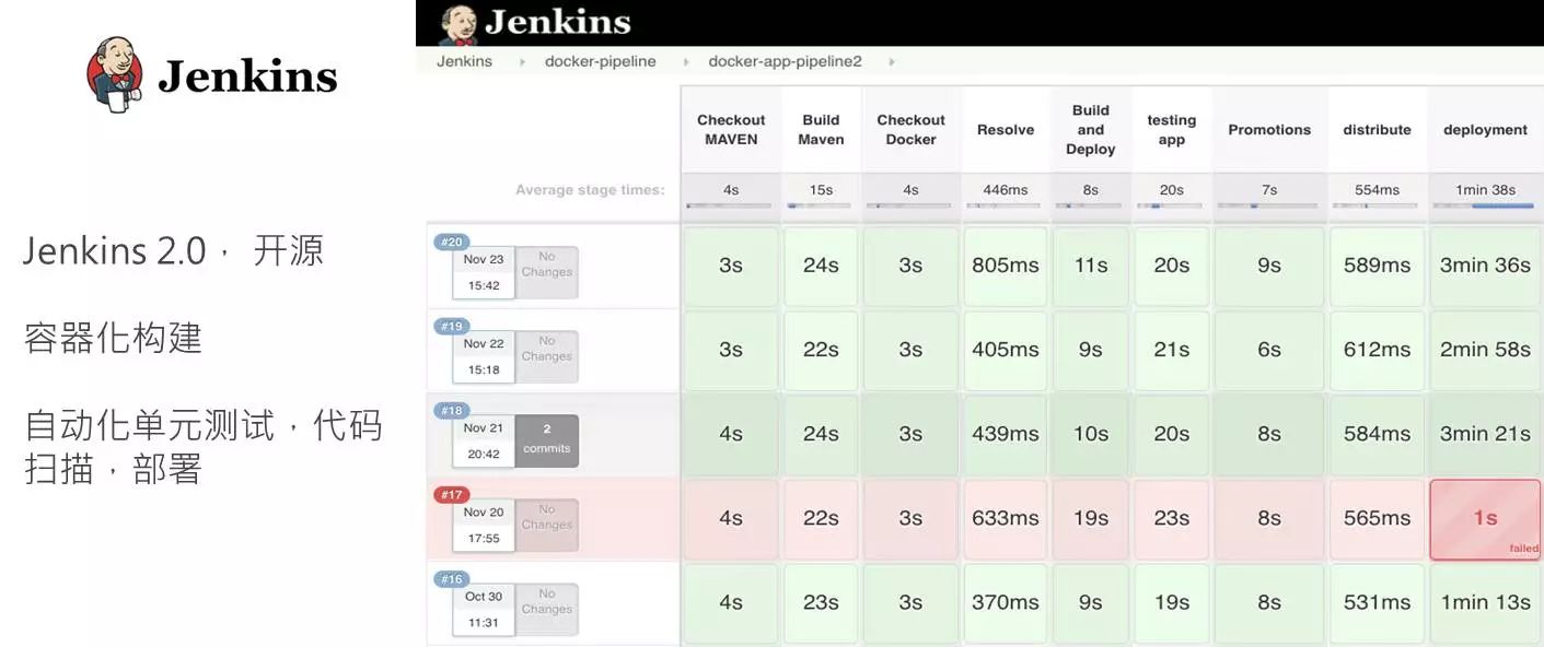 在座的有没用到 Jenkins 2.0Pipeline 插件?现在 Jenkins 创始人 KK 在每个大会上都会讲他的 Pipeline 插件概念。去年我参加了他在以色列的 Jenkins 大会,他在会上发布了 Pipeline 插件。但不管是用 Jenkins 或者别的工具,都要把一些可重复使用的阶段,比如测试、部署放在一个模块化的 CI 流水线里面, 开发者就可以自己上线、自己发布。现在一些大企业的团队就是自己上线、自己发布,他们采取微服务架构,不设定有变更日,随时都可以独立发布自己的模块,不用要协同所有模块一起。大家可以尝试 Jenkins Pipeline 这个插件,是开源免费的。