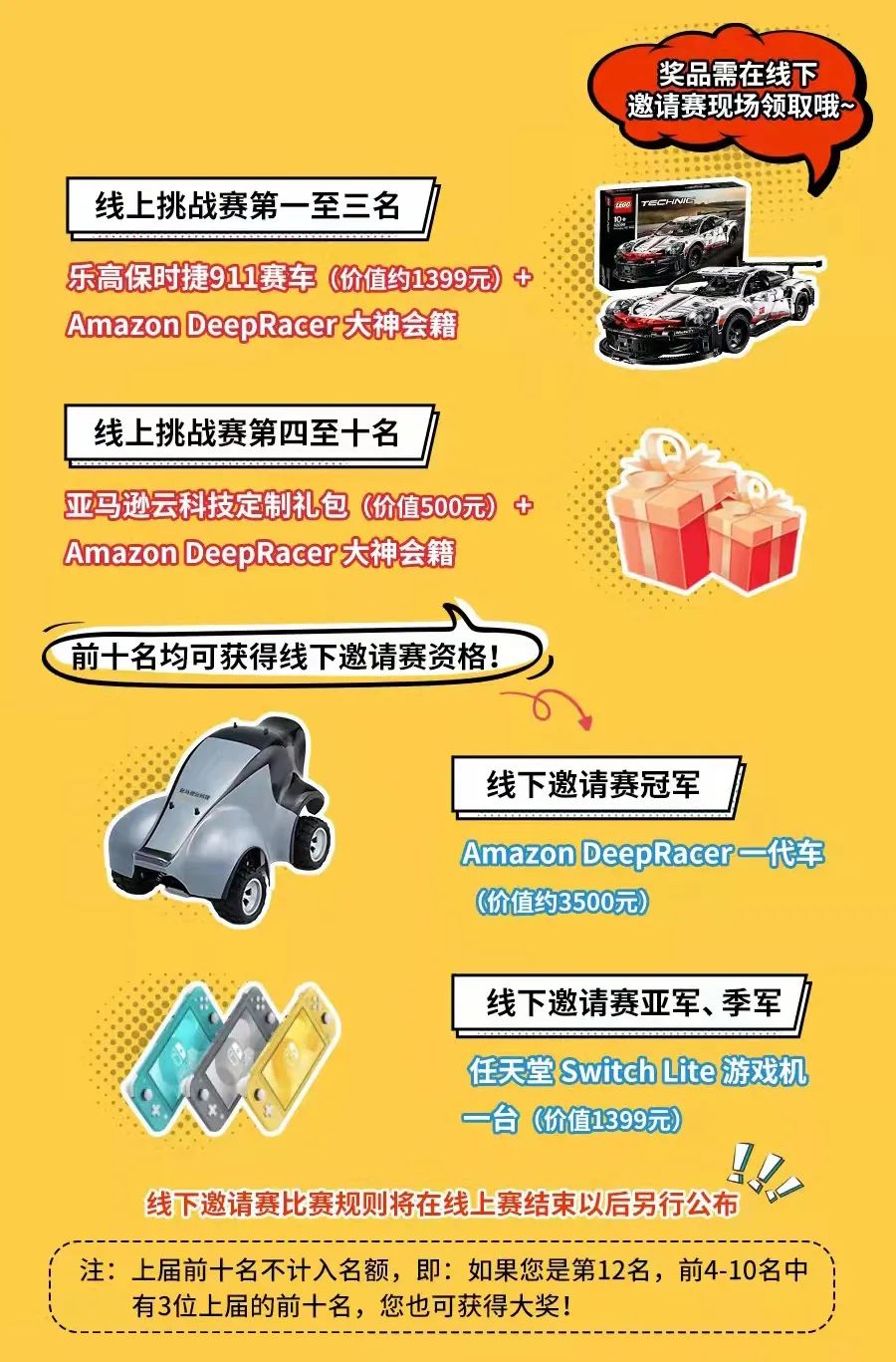 比赛奖励:线上挑战赛前10名的选手将收到邀请参与12月在上海举办的WAIC Amazon DeepRacer 线下赛(报销交通与酒店),同时所有奖品均在线下赛现场领取哦。