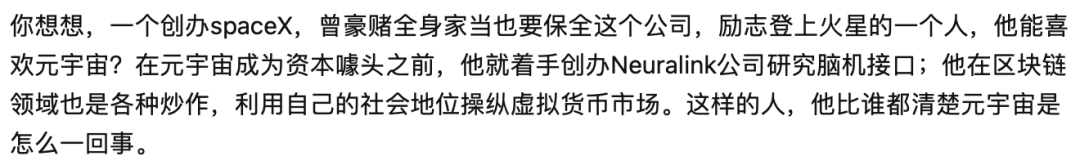 但是网友Moye表示,这么一个励志要上火星、重金研究脑机接口以及在NFT上左右横跳反复收割的人,对元宇宙这事必然是「门儿清」的。