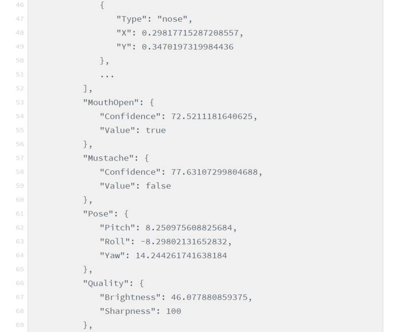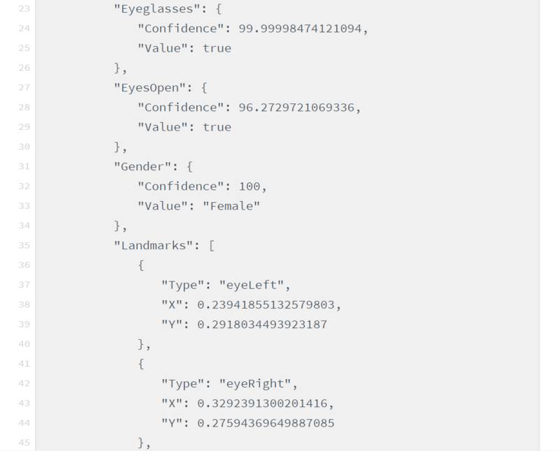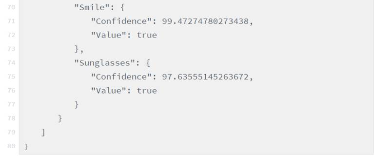 以上图的人脸检测 API 为例,用户可以通过输入的图像检测到面部的存在和位置。除了面部边界框和标注,API 还会反馈每张面孔的特征,如情感、性别、眼镜、睁眼或闭眼、胡须、微笑等。