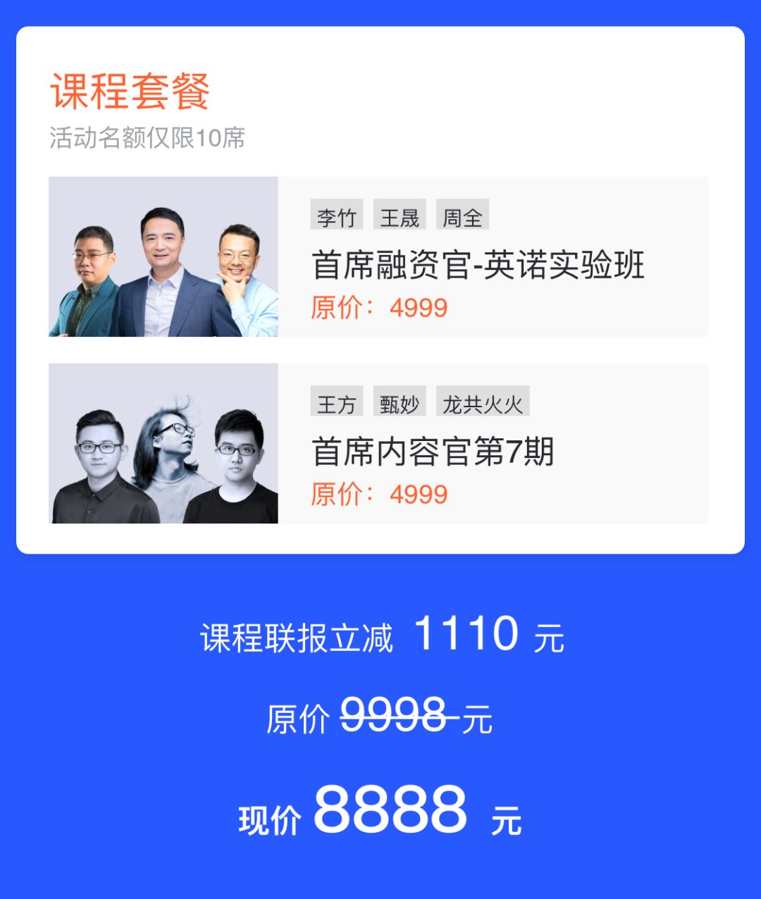 首席融资官课程详细内容,请点击下方图片了解。现在两门课程联报,立享优惠,仅限10名,先到先得!
