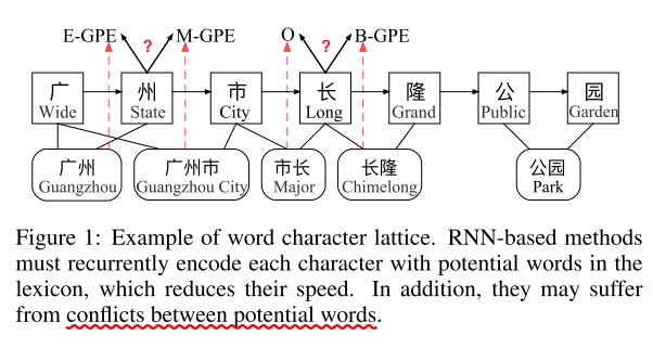 Lexicon冲突问题: 当句子中的某个字符可能与lexicon中的多个word有关时,基于RNN的模型难以对此做出判断。例如,图一中的"长"可能属于"市长"一词,也可能属于"长隆"一词,而对"长"所属lexicon word判断的不同,将导致对字符"长"预测的标签不同。