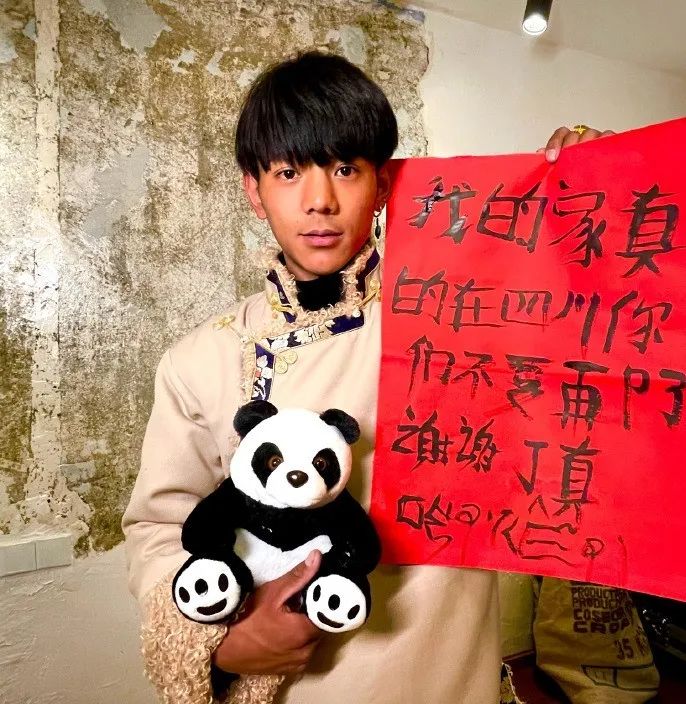 为了重申自己“属于”四川理塘县的,丁真手抱熊猫,用红纸黑字写下“我的家真的在四川,你们不要再P了”的大字。