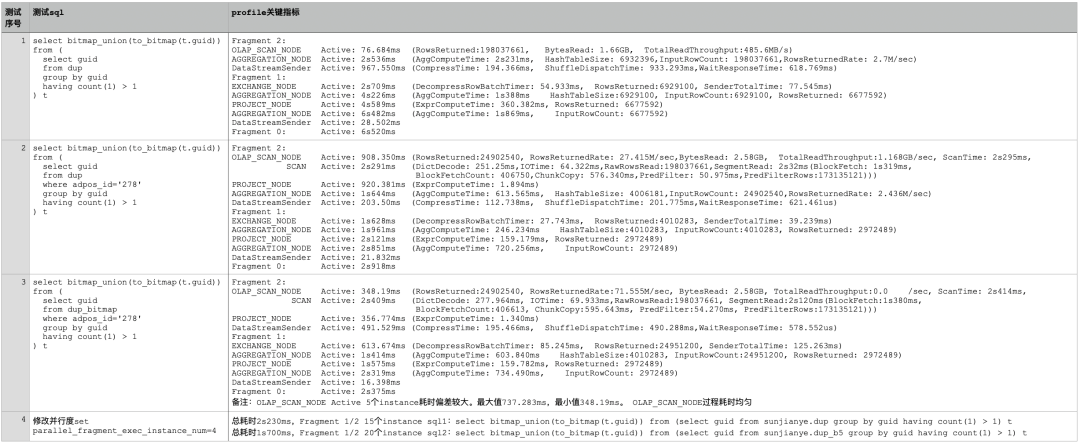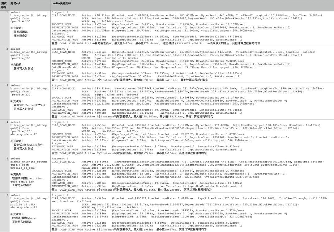 测试所用集群:32C 96G 1TSSD * 5台,3个FE,5个BE,5个Broker。1.19.5版本表数据:2.58亿行,3个指标列,单副本约1.7G,AGGREGATE KEY(`guid`), DISTRIBUTED BY HASH(`guid`),数据分布均匀。1.profile_b5表 bucket 5 共5个tablet 每个tablet 365M2.profile_b20表 bucket 20 共20个tablet 每个tablet 95M3.profile_b5_p5kw表 bucket 5 共30个tablet 每个tablet 67M1)profile_b5_p5kw表中adpos_id、unit_id加bitmap索引。2)profile_b5_p5kw表按PARTITION BY RANGE(`guid`) 每5kw一个分区。测试数据说明:Fragment 1有5个instance,下边均采用ip为211的instance相关数据。Fragment 0有1个instance,直接引用结果。数据均为多次查询后取相对合理且耗时较少的profile信息此测试前已有认知:离线标签采用profile+dup模型测试bitmap_union(to_bitmap(guid))性能,单BE 1个instance 1500W/s,to_bitmap耗时是bitmap_union耗时的2倍左右,两个算子耗时主要由guid数量决定。bitmap_union算子耗时与单个tablet内guid集中度有关,guid取值范围越集中性能越好,建表时采用Range guid分区,步调1000W,bucket为1。
