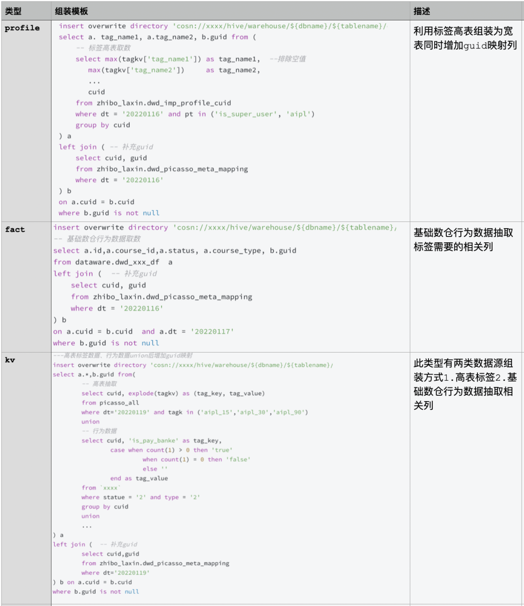 常规标签数据当计算完成后可统一写入指定的高表【建表语句见下方】中,以高表为媒介做到标签开发和接入的解耦。带有修饰、行为类标签数据可直接利用基础数仓表和标签源数据信息完成自动接入。