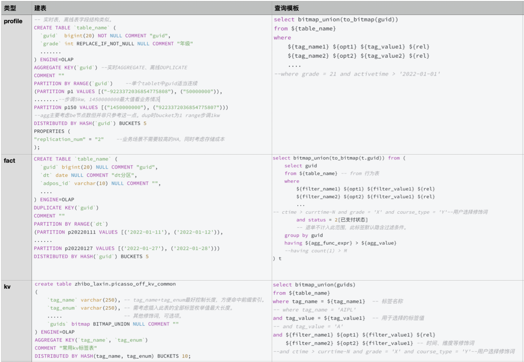 根据需求场景、性能、灵活性等方面因素考虑,将标签信息抽象为如下几类进行存储。每个分类会对应一个查询模板解决不同业务场景问题。因读写性能、标签更新时效、幂等接入等因素考虑,同一个类型支持了多个 StarRocks 表模型,同一标签也可存储在不同业务类型表中。