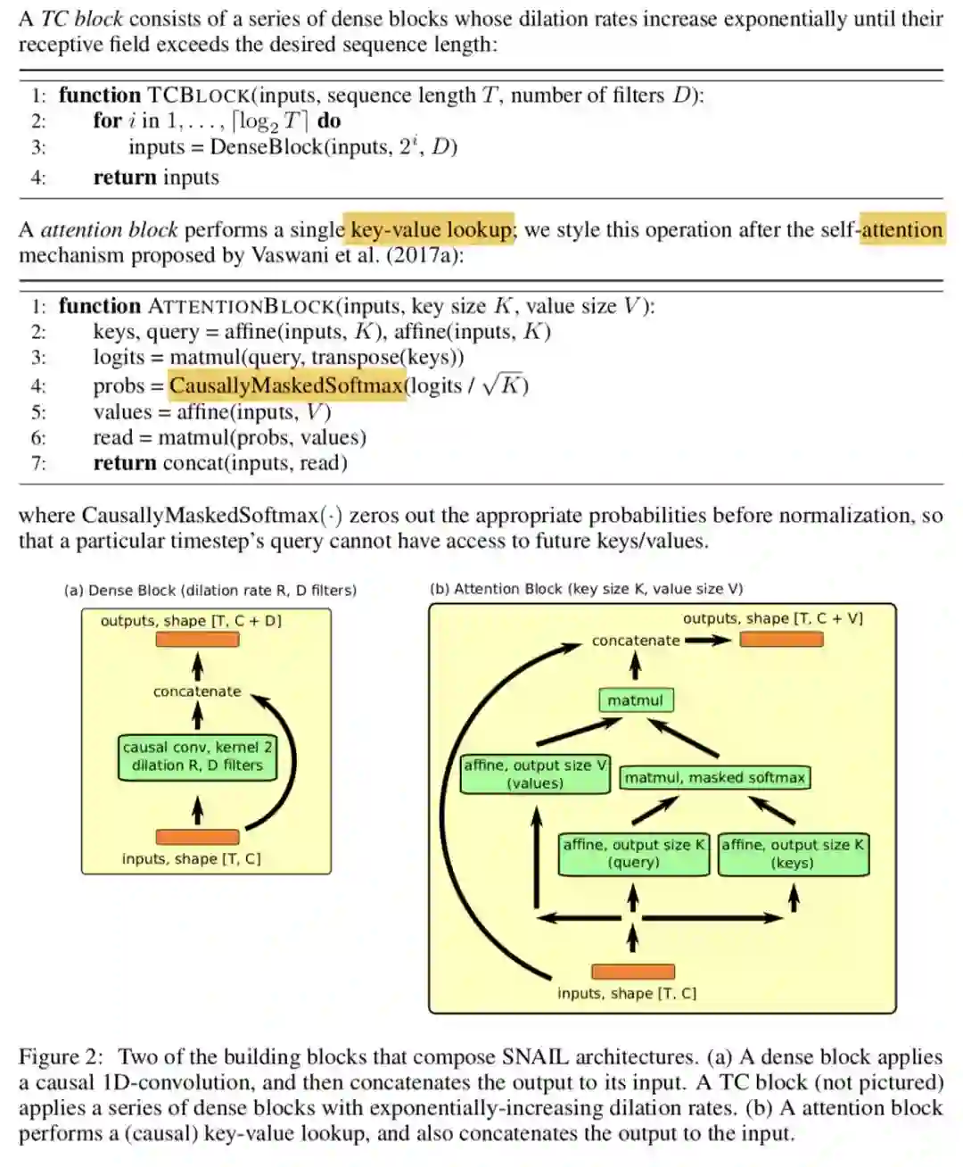 construct SNAIL by combining the two: we use temporal convolutions to produce the context over which we use a causal attention operation. By interleaving TC layers with causal attention layers, SNAIL can have high-bandwidth access over its past experience without constraints on the amount of experience it can effectively use. By using attention at multiple stages within a model that is trained end-to-end, SNAIL can learn what pieces of information to pick out from the experience it gathers, as well as a feature representation that is amenable to doing so easily. As an additional benefit, SNAIL architectures are easier to train than traditional RNNs such as LSTM or GRUs