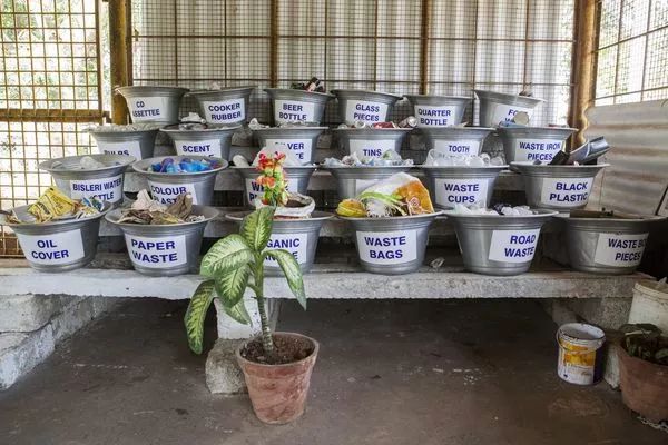 迈索尔市政公司运营的一处垃圾回收中心,放置在容器里的生活垃圾